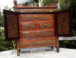 Antique Folk Art Carved Wood Hand Painted Table Top Cabinet. A superb decorative pine wooden cupboard with a rich and colorful painting. This extremely decorative Folk Art cabinet is a beautiful piece of history from that time.