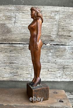 Up for sale is a neat art deco wood carving of a nude woman with heels on a wood base. All carved from a single piece of wood. Loads of details on the carving. Super nice face and hair.