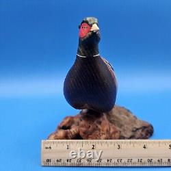This unique wood carving features a beautiful ringneck pheasant in hand-crafted detail. The piece is a special edition folk art mount, measuring 10 inches in length and 5.5 inches in height. The pheasant is carved from burl wood and painted in vivid multicolor, making it a stunning addition to any collection. The carving is a limited edition, retired piece that is perfect for all occasions. It is a handmade item that showcases the artistry of the carver.
